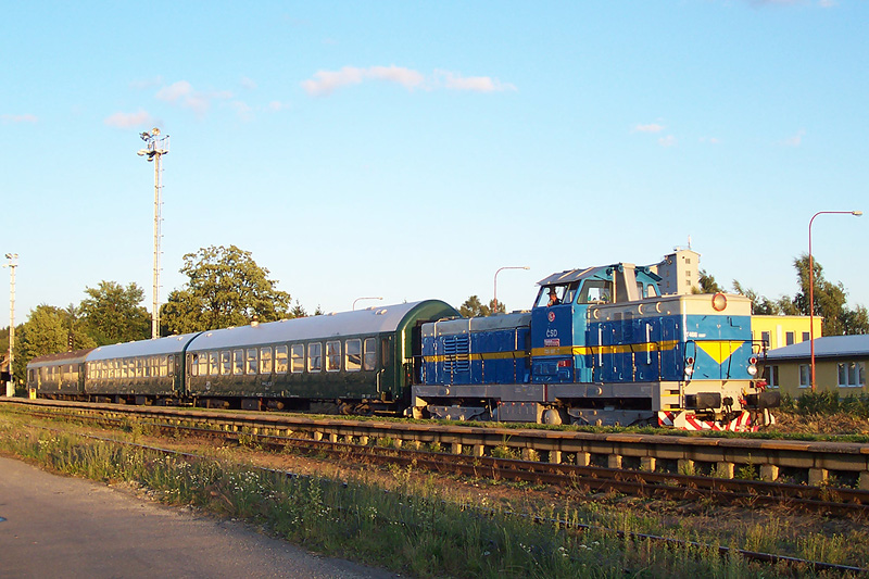 Lokomotiva 735.007 se soupravou osobního vlaku složeného z vozů Bh a Ds v Bystřici nad Pernštejnem 6. července 2007